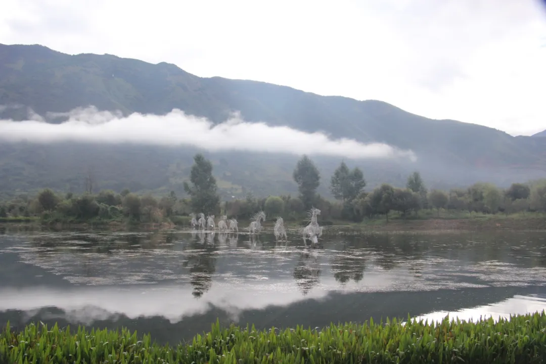 从凤羽古镇前往「曾曾的书屋」、空中稻田剧场等展区的路上,无需低头赶路,留意绝美的沿途风光。江登湿地公园里水天一色,有惊艳的白鹭纷飞,秋高水静的一片水塘,时常有村民静钓。白云之中的八匹马,像从天马草山的山顶奔赴而来,停留在镜像般的水面上。